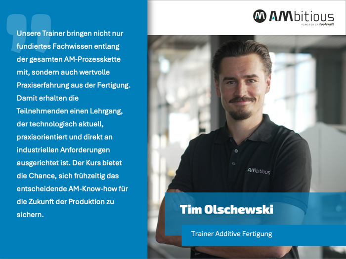 Gemeinsam mit unserem Kooperationspartner AMbitious (powered by toolcraft) verbinden wir die theoretische Wissensvermittlung durch die IHK Mainfranken mit hohem Praxisbezug. Als Experten der Kunststoff- und Metallbranche vertiefen wir innerhalb der Praxiswochen die wesentlichen Fertigungsverfahren und geben praxisnahe Einblicke in Themen wie Konstruktion, Simulation und Post-Processing.