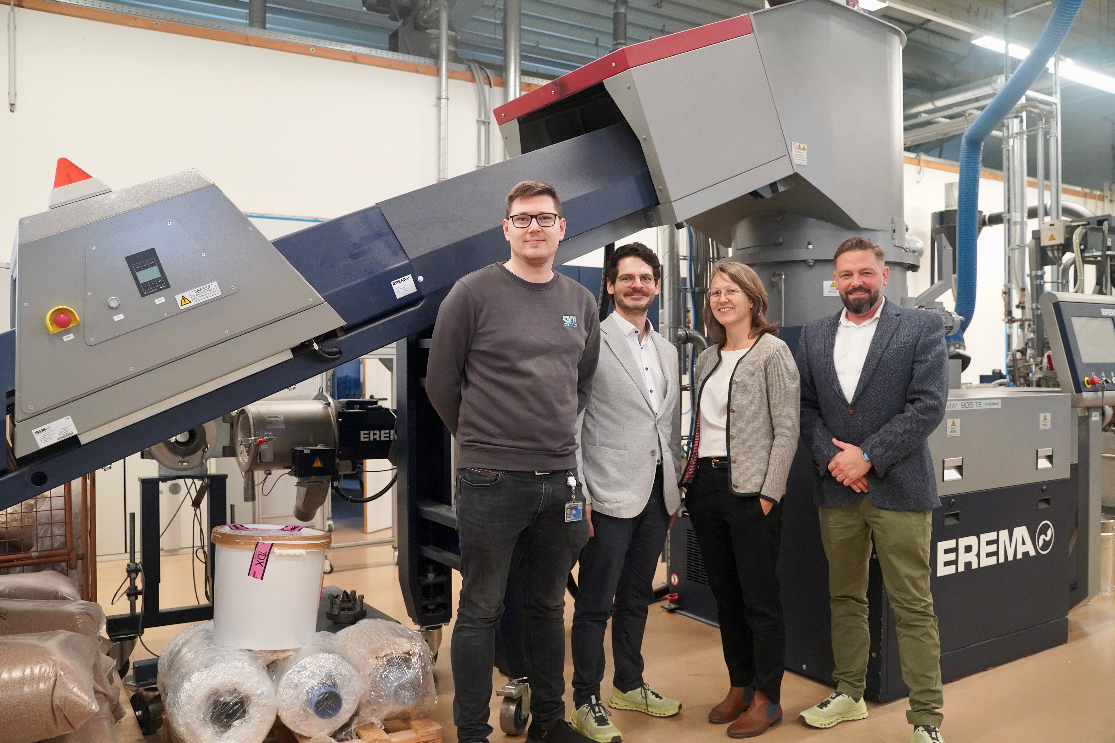Das LaMa Recycling Projektteam führt am SKZ ein innovatives Forschungsvorhaben zur Entwicklung eines neuartigen Recyclingprozesses im Rahmen des Förderprogramms „EXIST-Forschungstransfer“ (von links) :Stefan Zuljevic, Dr. Lars Helmlinger, Dr. Marieluise Lang und Thomas Wolz. (Foto: SKZ)