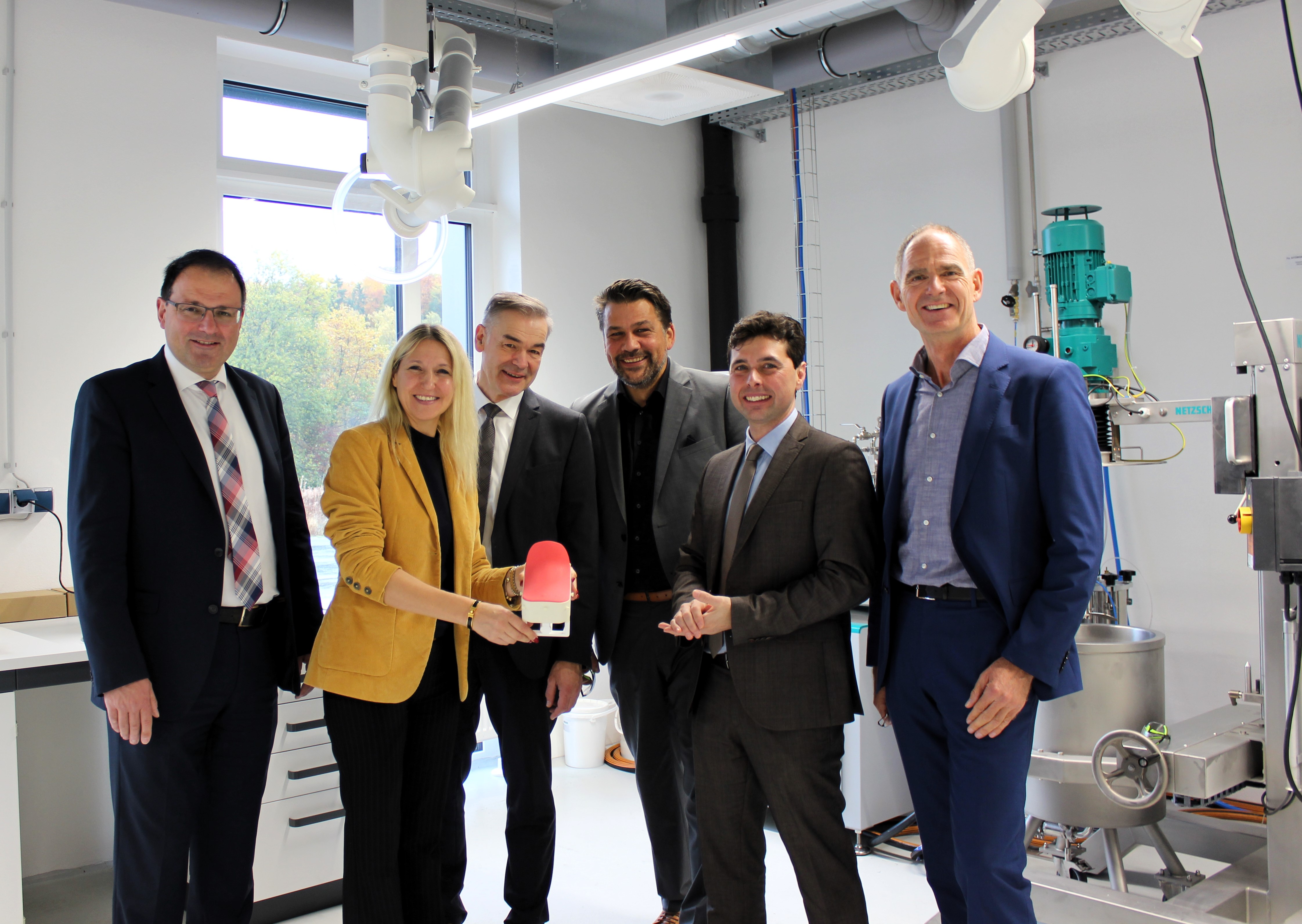 Besichtigung des Dispergier-Technikums am Europäischen Zentrum für Dispersionstechnologien (EZD) v.l.n.r: Martin Schöffel (Staatssekretär im Bayerischen Staatsministerium der Finanzen und für Heimat), Dr. Silke Launert (Parlamentarische Staatssekretärin im Bundesministerium für Forschung, Technologie und Raumfahrt), Landrat Peter Berek (Landkreis Wunsiedel im Fichtelgebirge), Carsten Hentschel (2. Bürgermeister der Stadt Selb), Dr. Felipe Wolff Fabris (Standortleiter EZD) und Prof. Dr.-Ing. Martin Bastian (SKZ - Vorstandsvorsitzender / Präsident der Zuse-Gemeinschaft) (Foto: EZD)